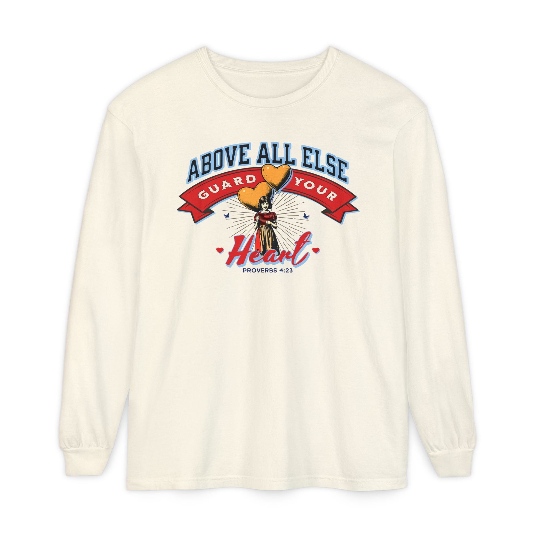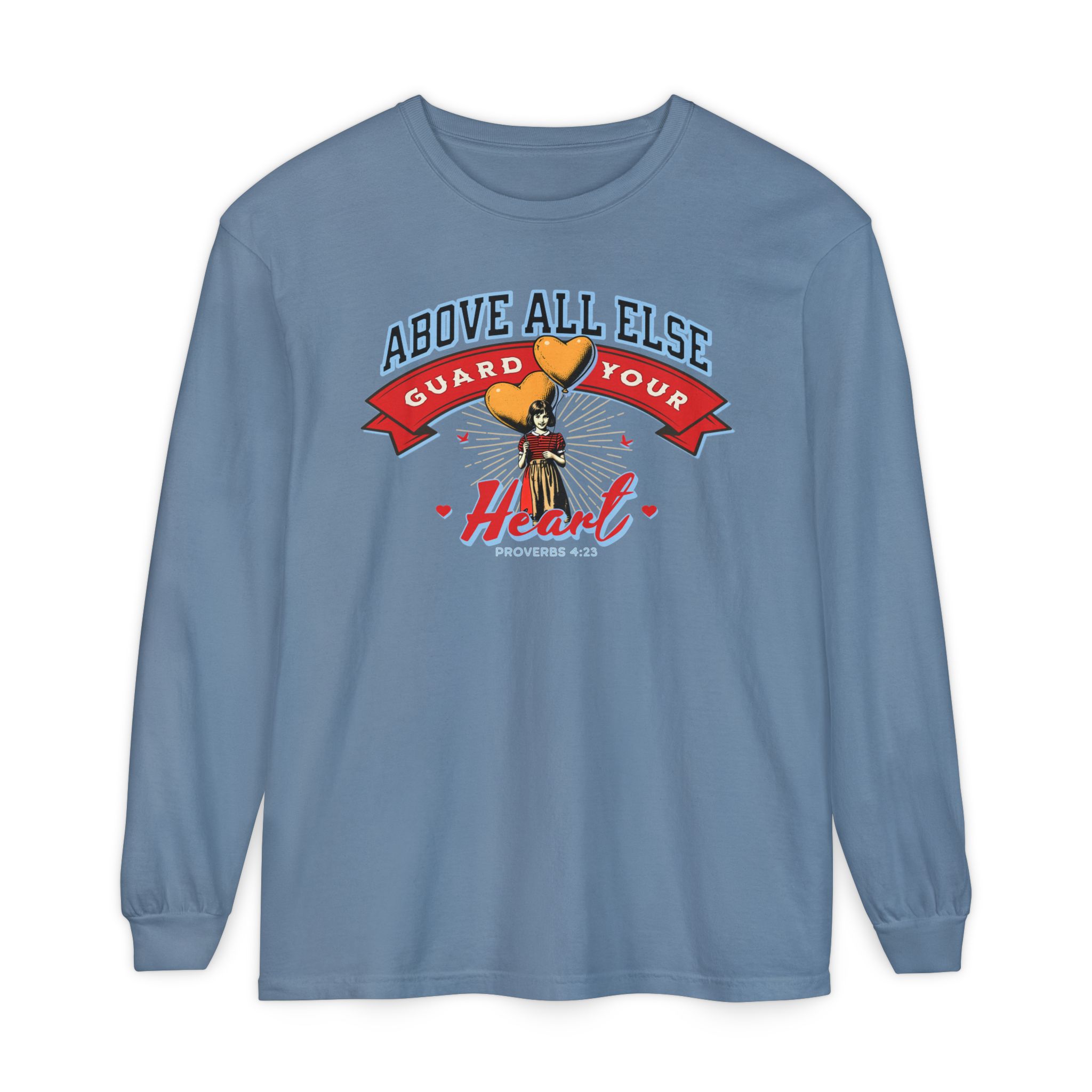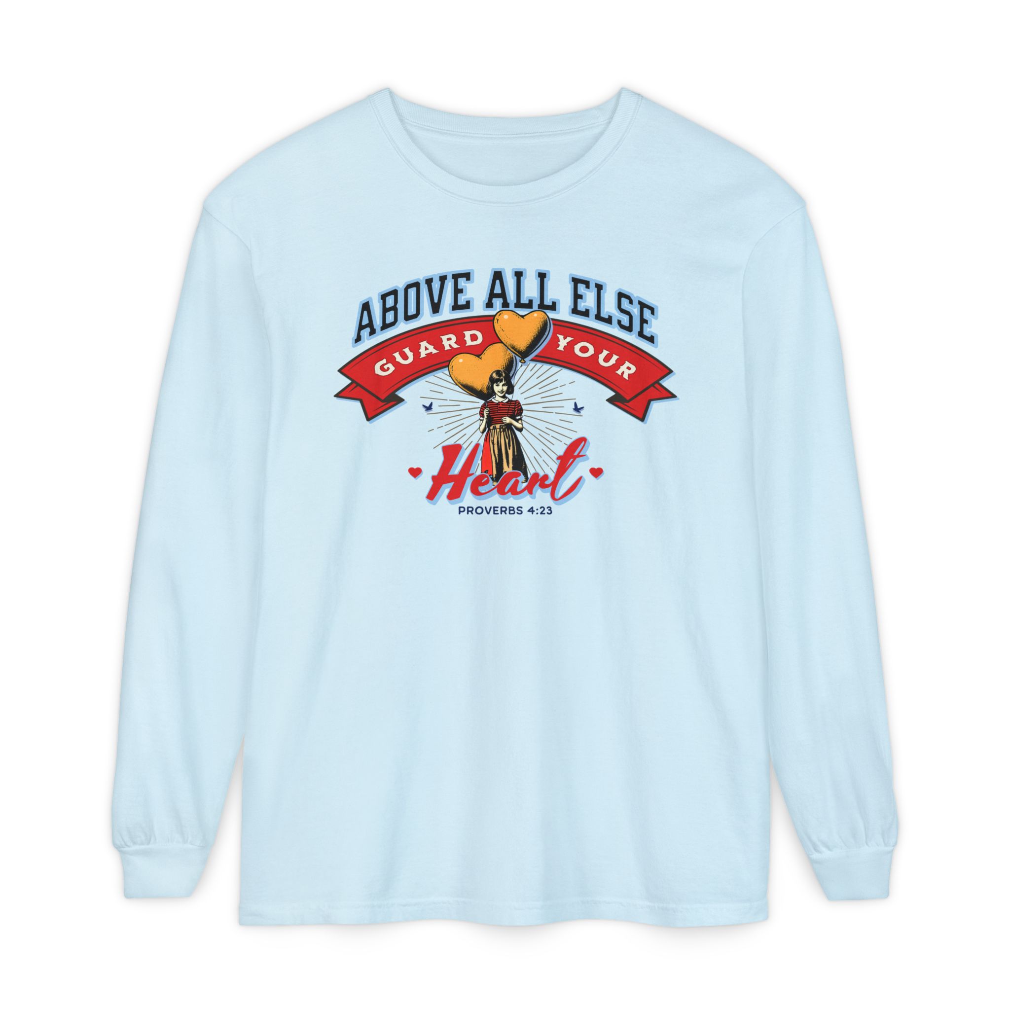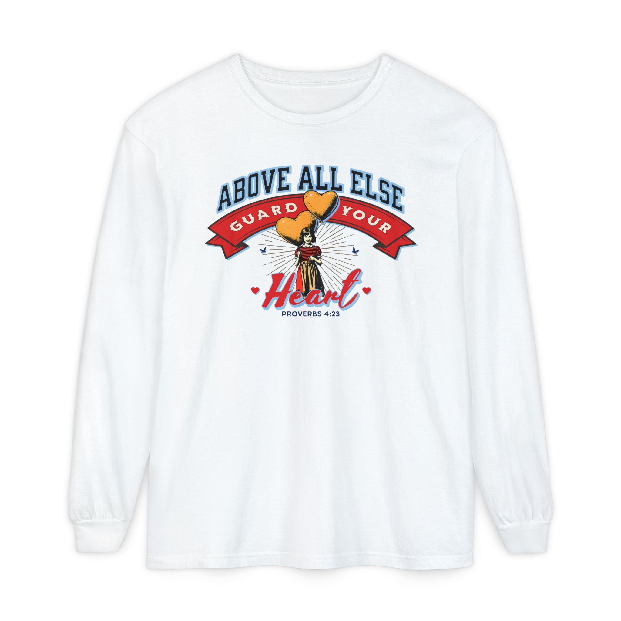 Sweet, soft, and full of truth—this Comfort Colors long sleeve tee features a vintage-style illustration of a little girl holding heart-shaped balloons alongside the timeless scripture from Proverbs 4:23: