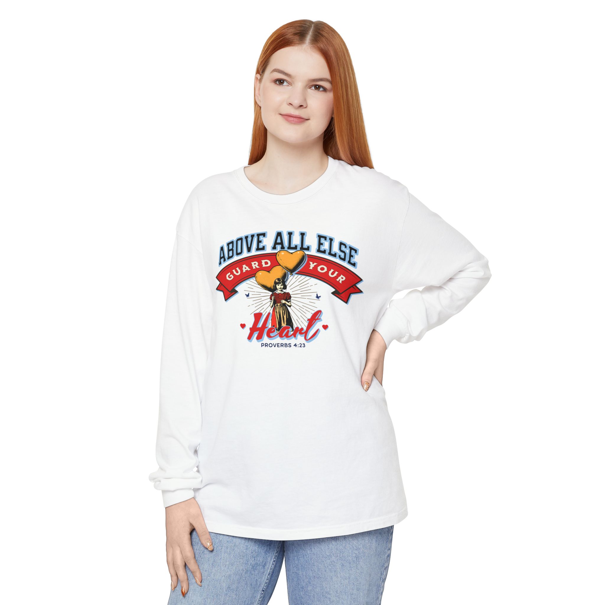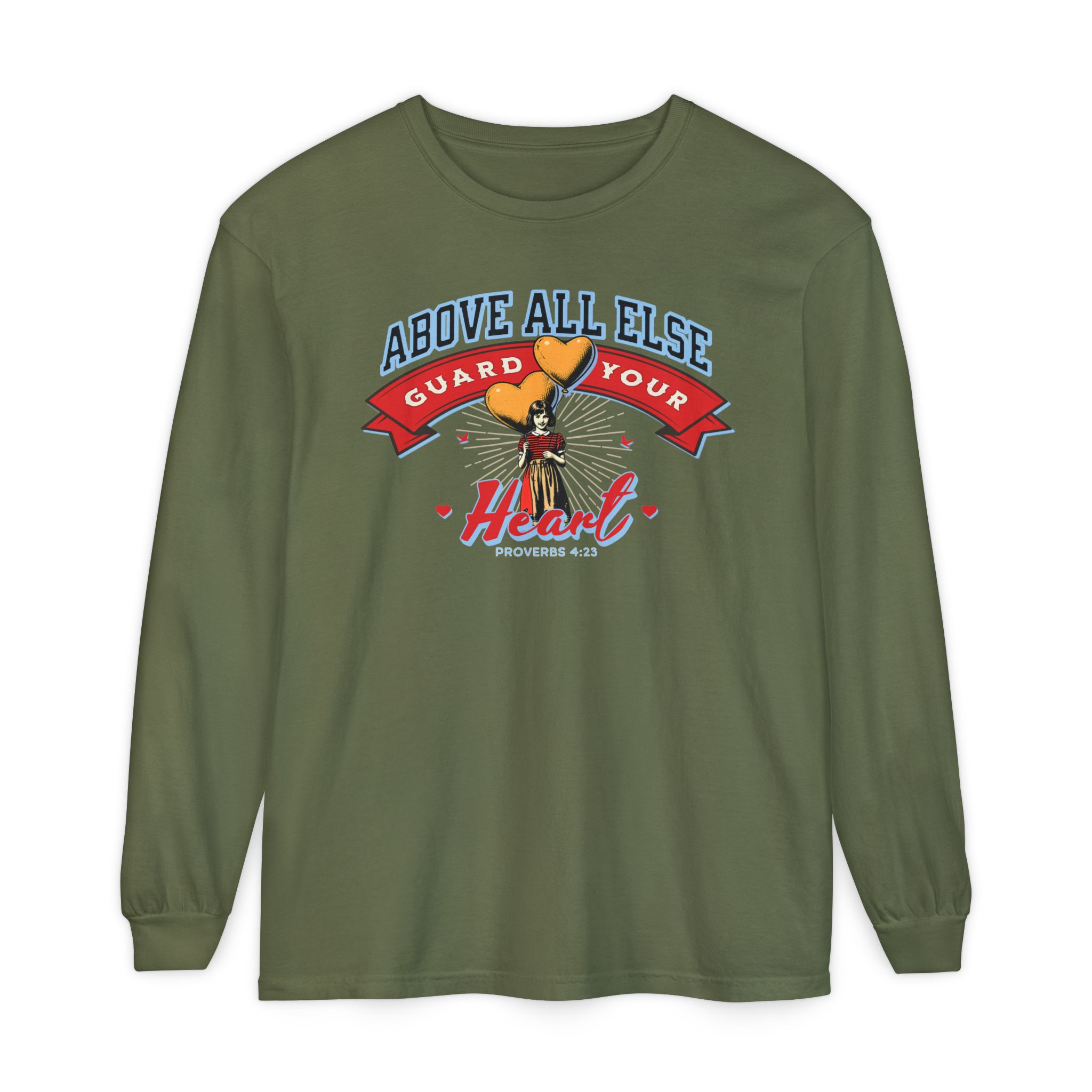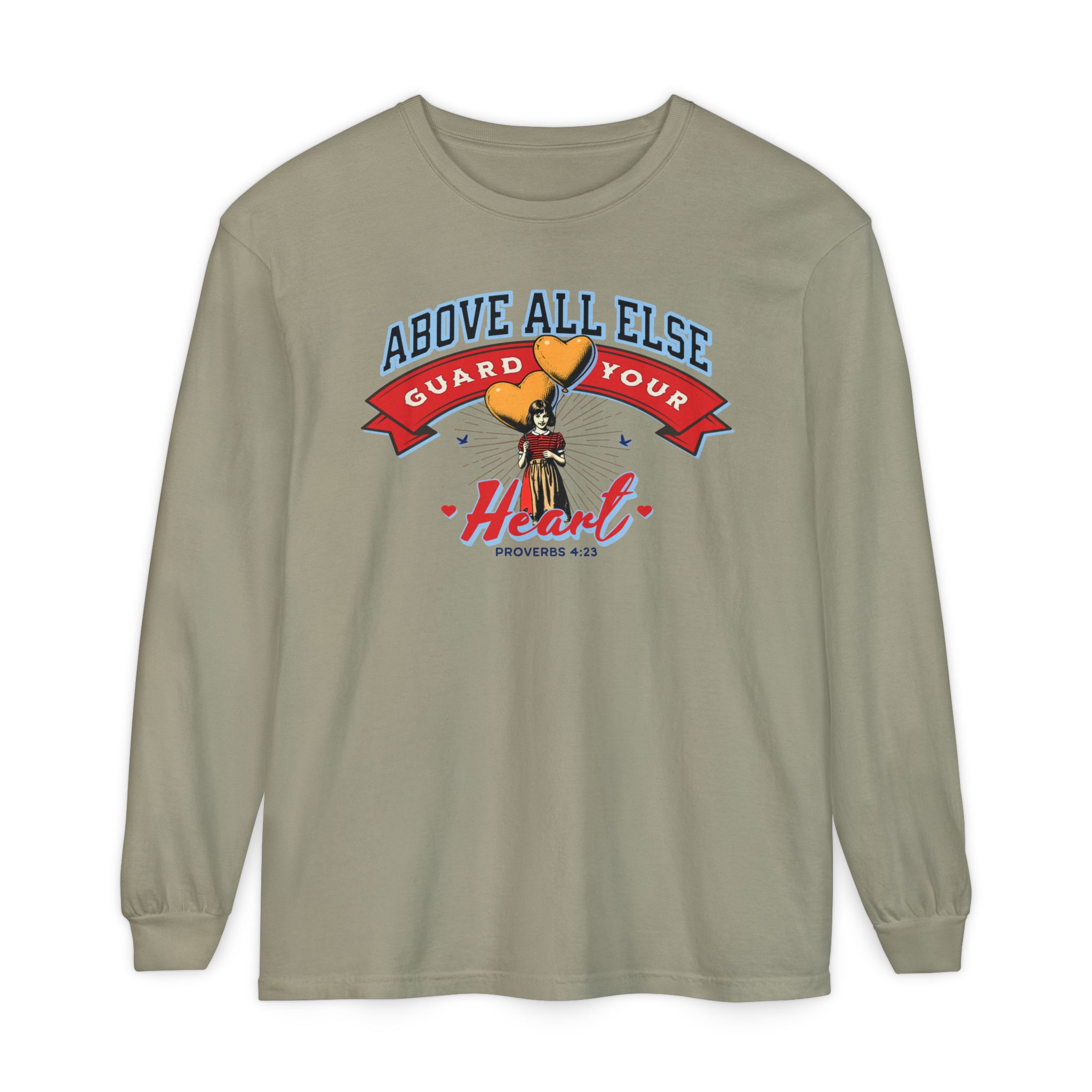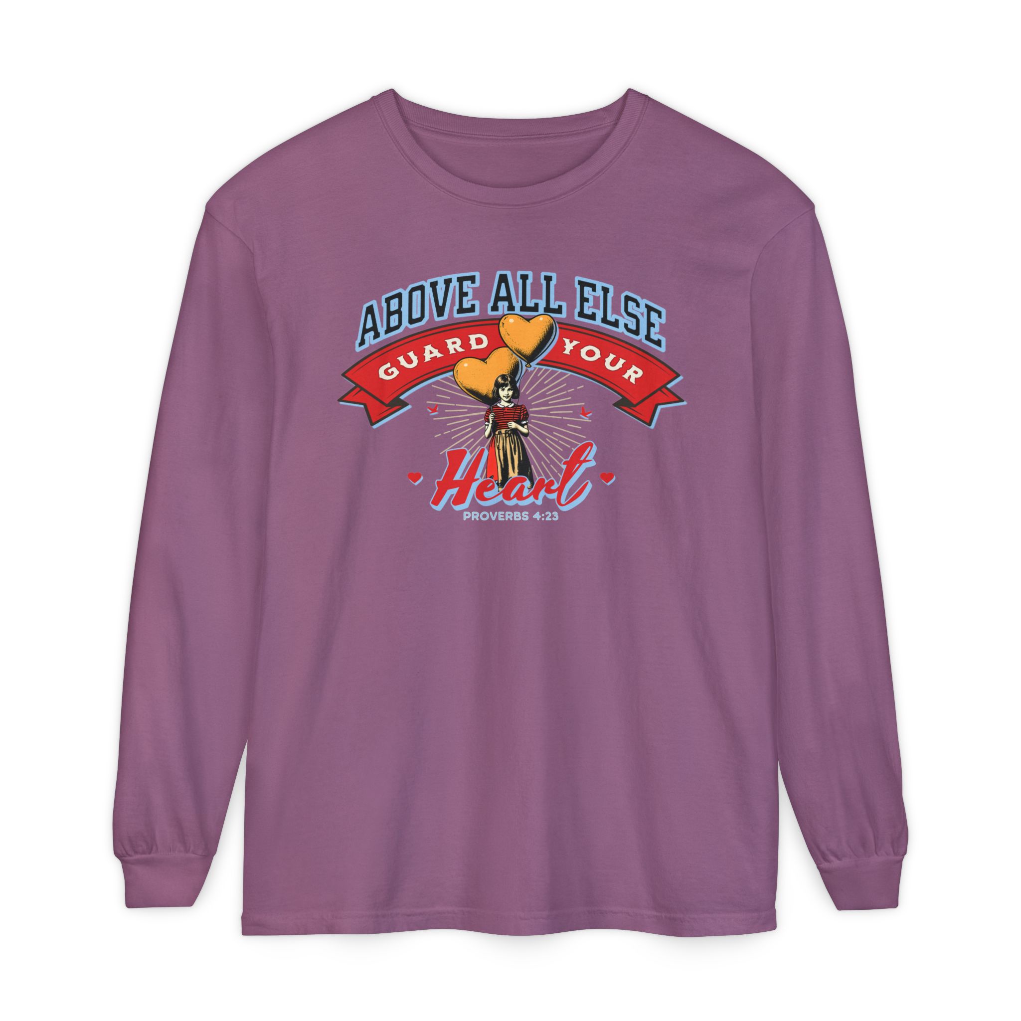 Sweet, soft, and full of truth—this Comfort Colors long sleeve tee features a vintage-style illustration of a little girl holding heart-shaped balloons alongside the timeless scripture from Proverbs 4:23: