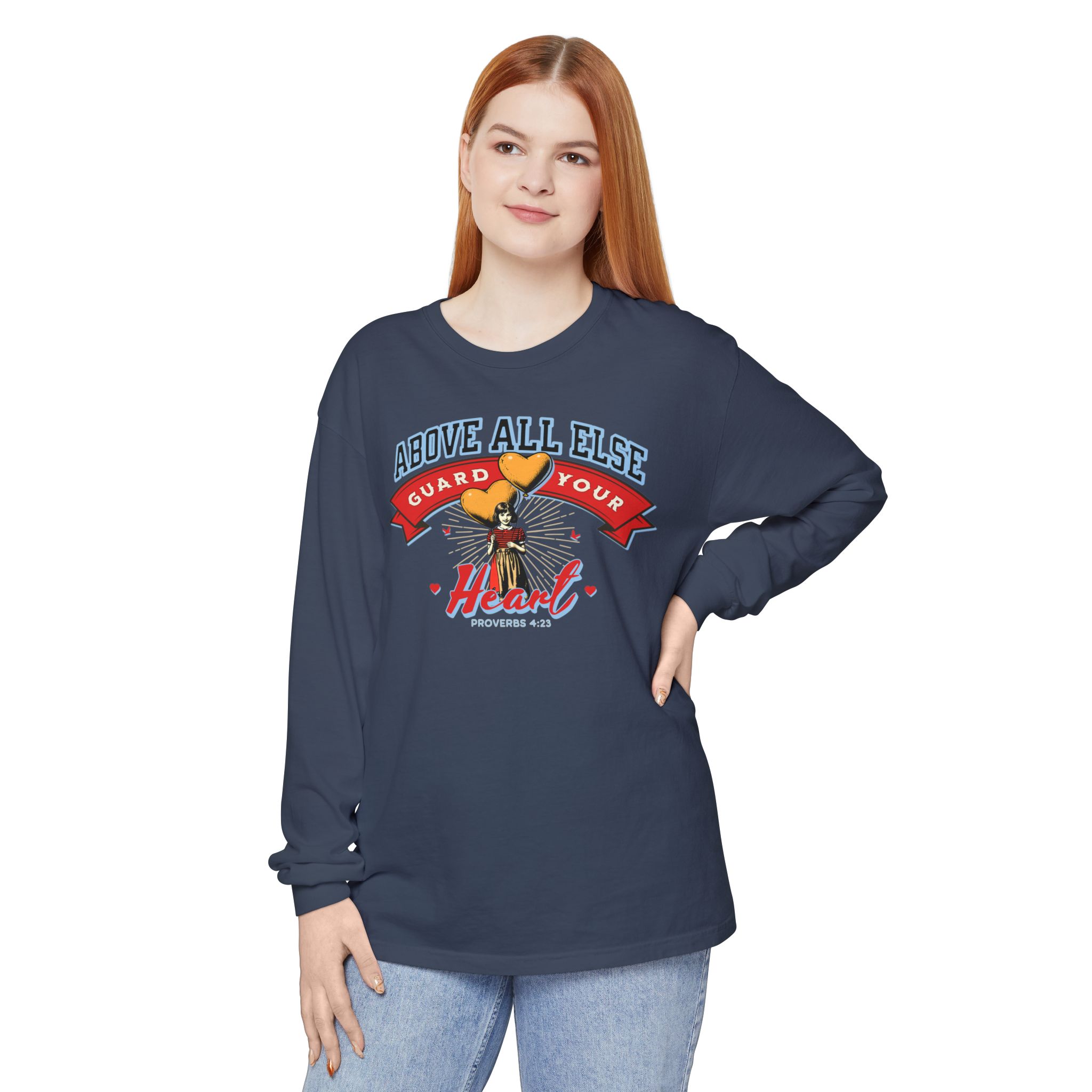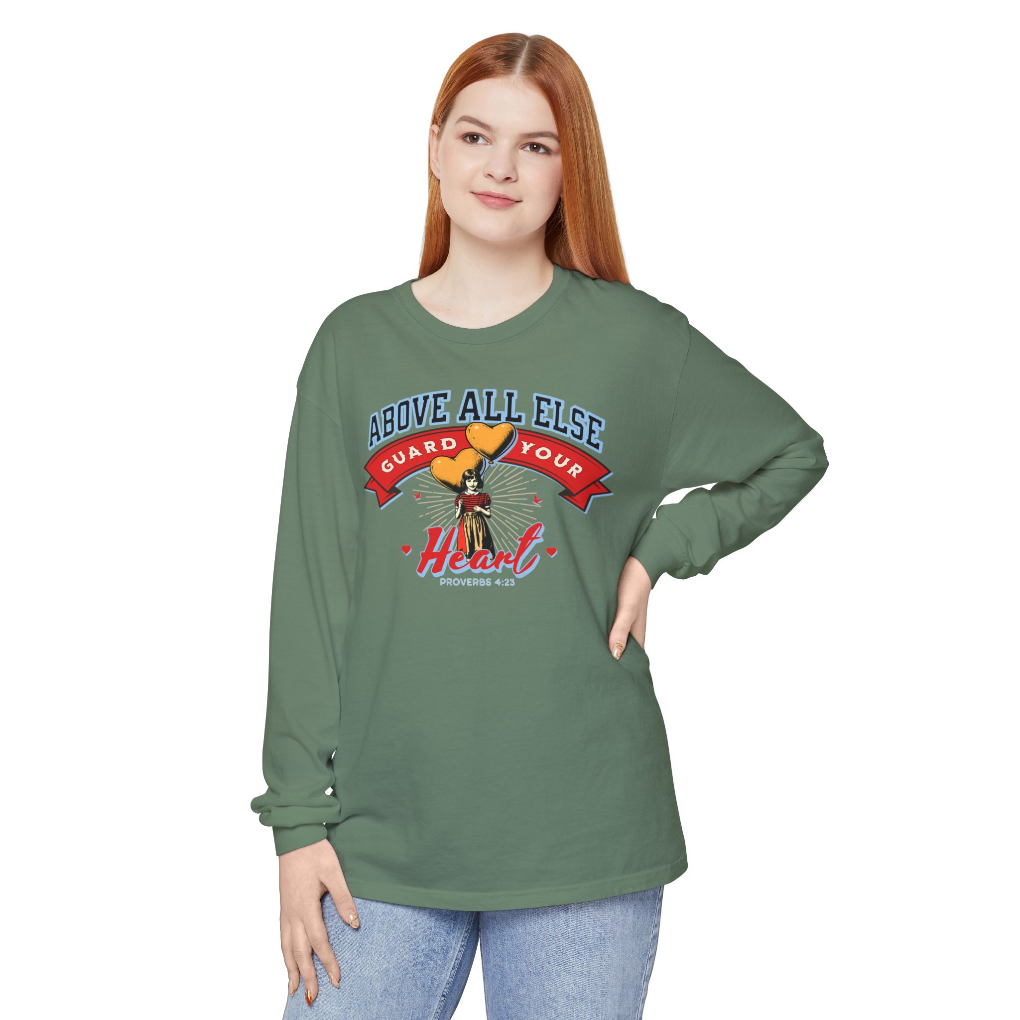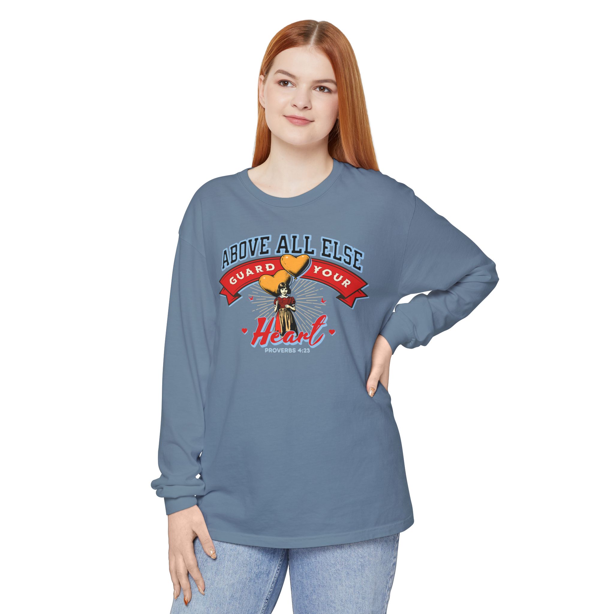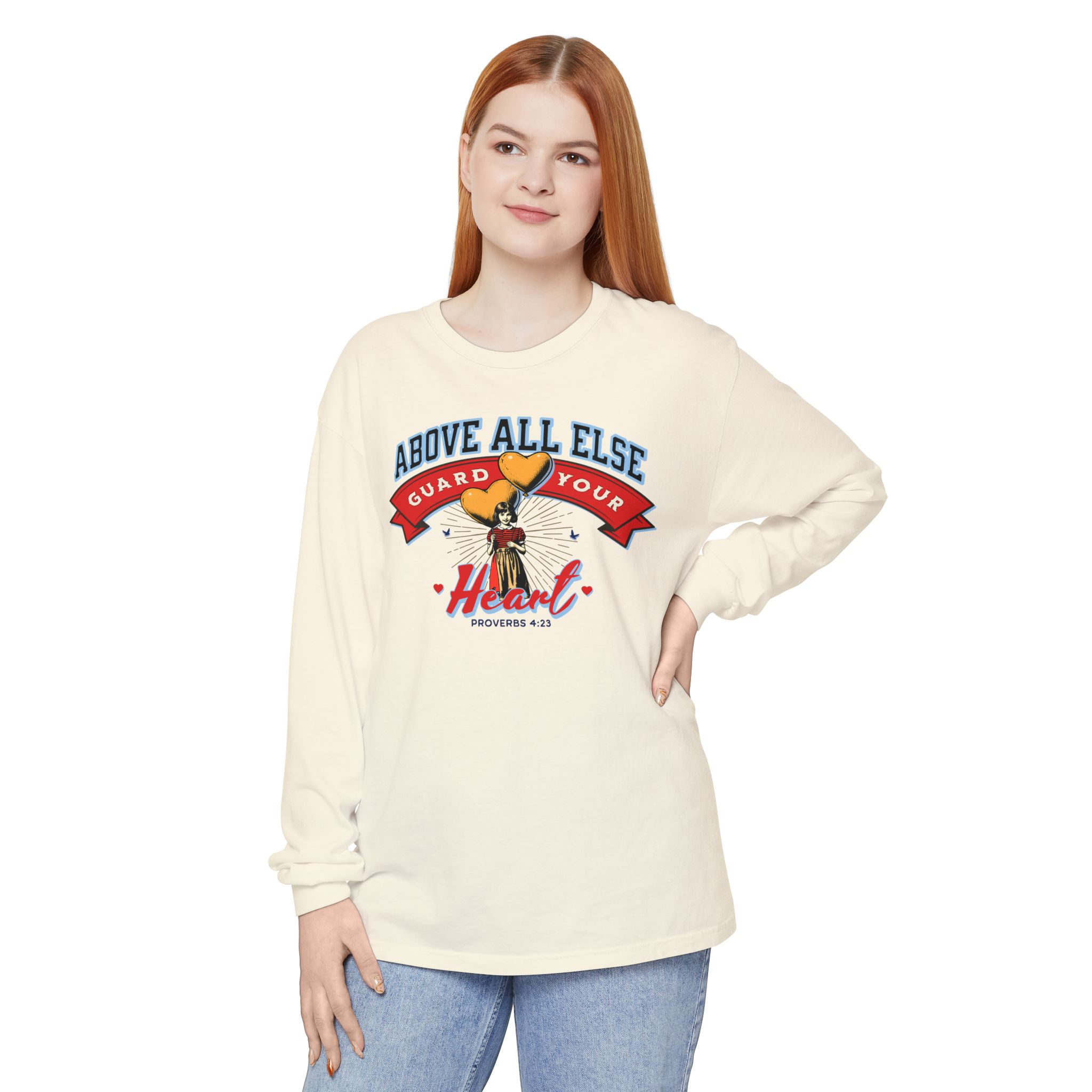 Sweet, soft, and full of truth—this Comfort Colors long sleeve tee features a vintage-style illustration of a little girl holding heart-shaped balloons alongside the timeless scripture from Proverbs 4:23:
