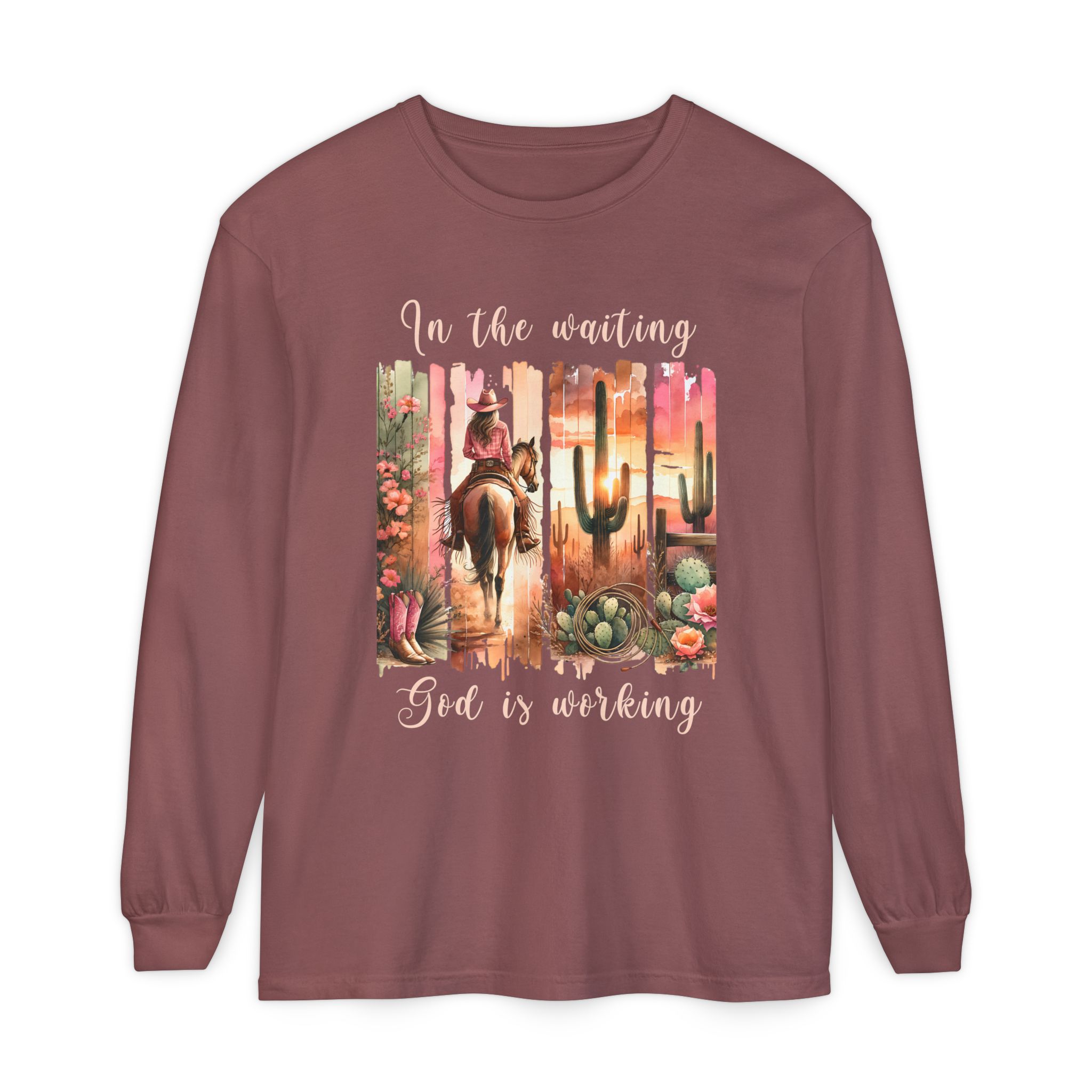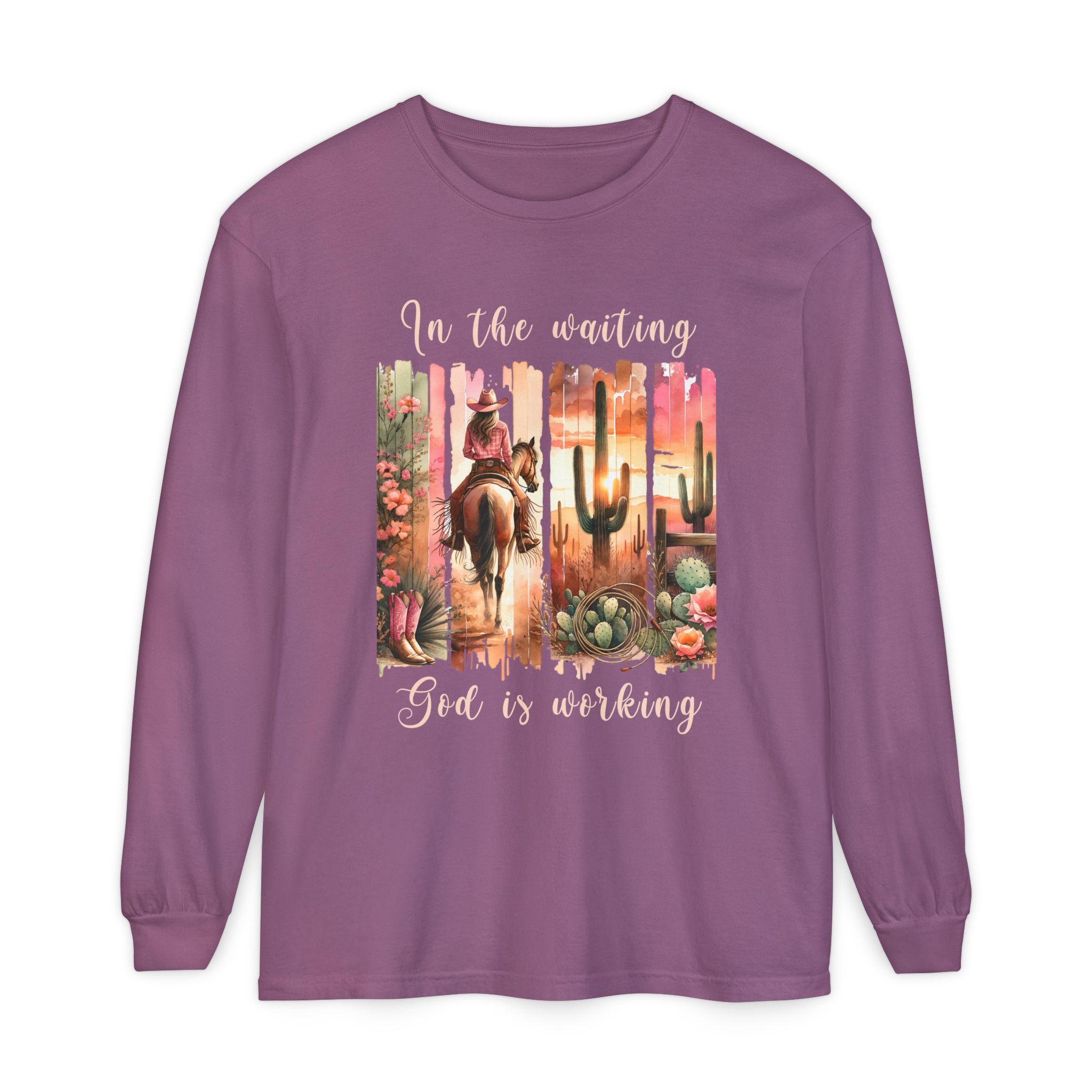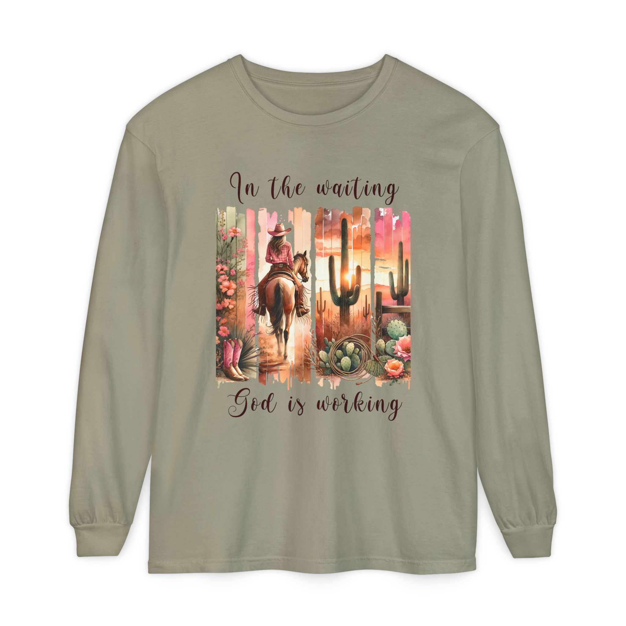 In the Waiting God Is Working | Western Desert Comfort Colors Long Sleeve