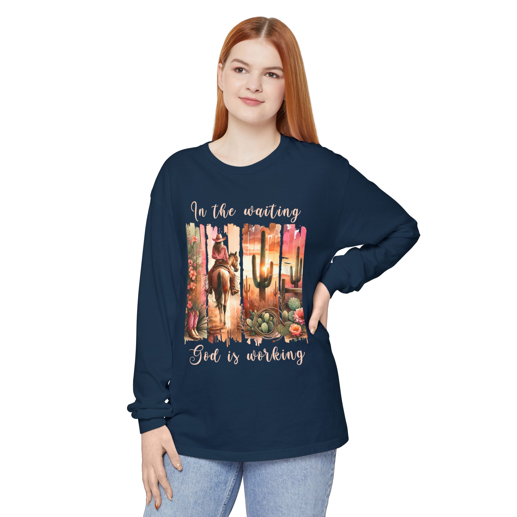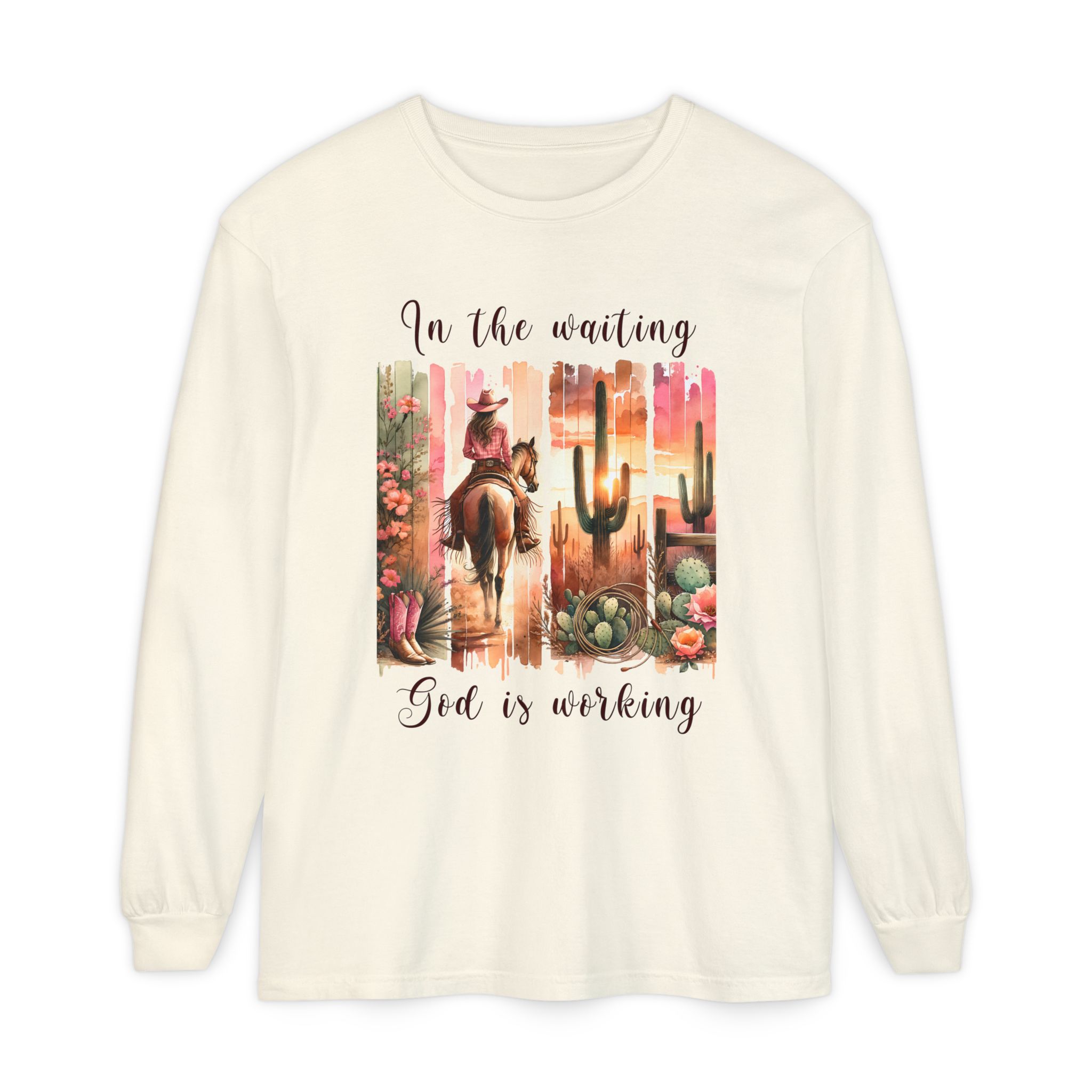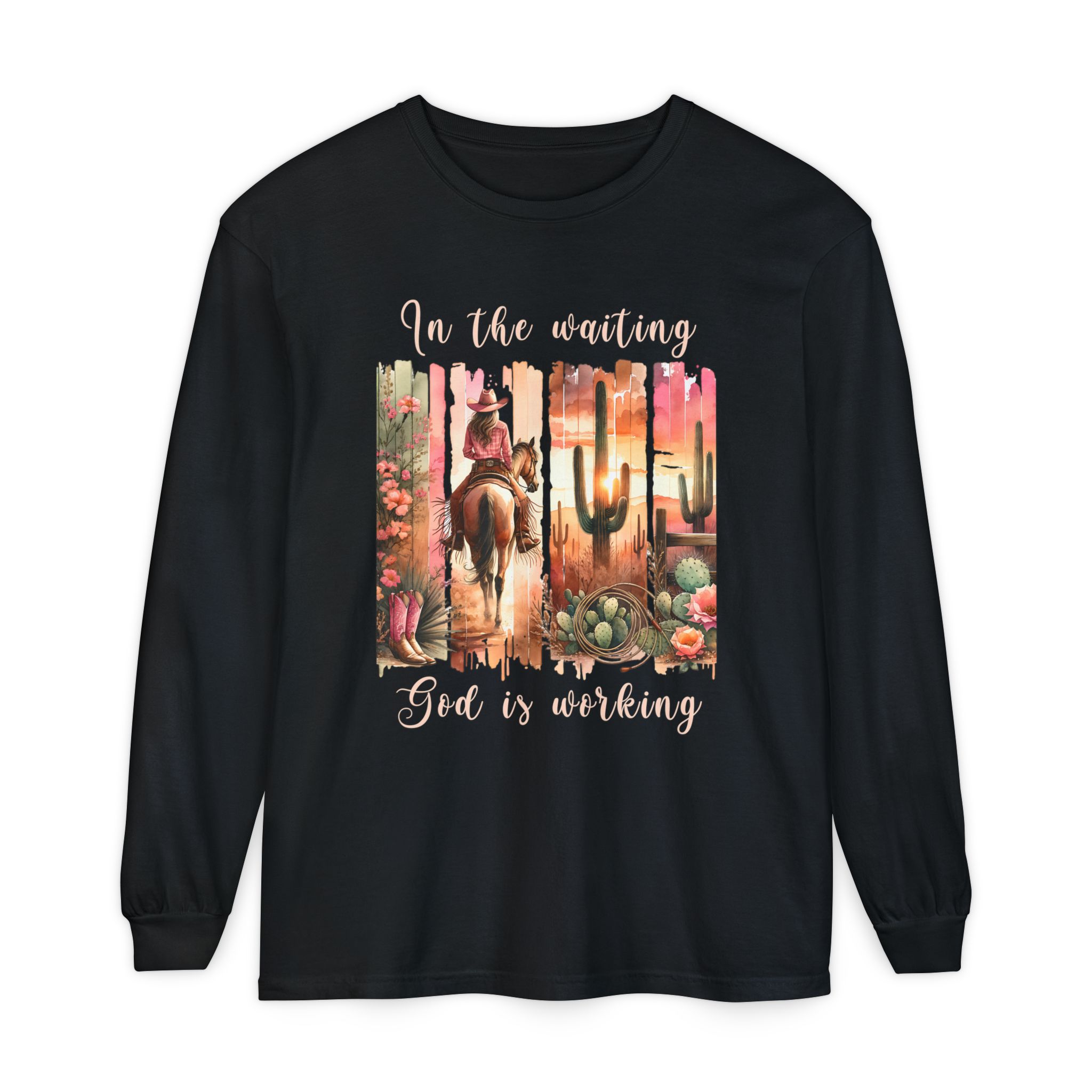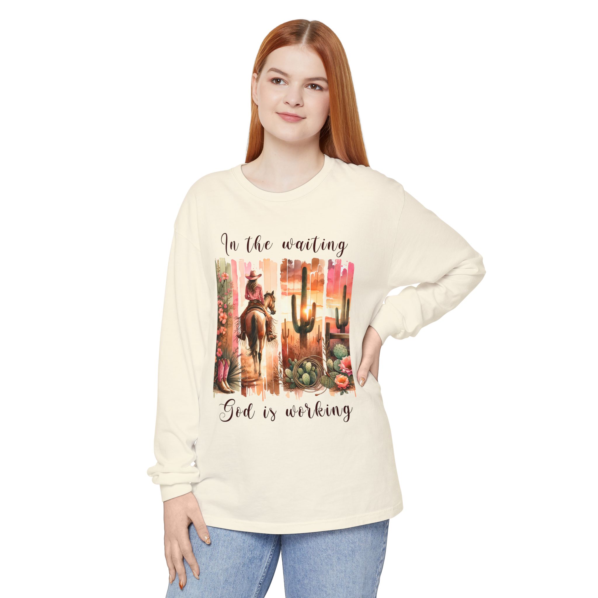 This Comfort Colors® long sleeve tee blends western charm with timeless truth. Featuring a desert sunset scene of a cowgirl riding her horse among cactus and roses, the design reminds us that even in the waiting, God is faithfully at work behind the scenes.