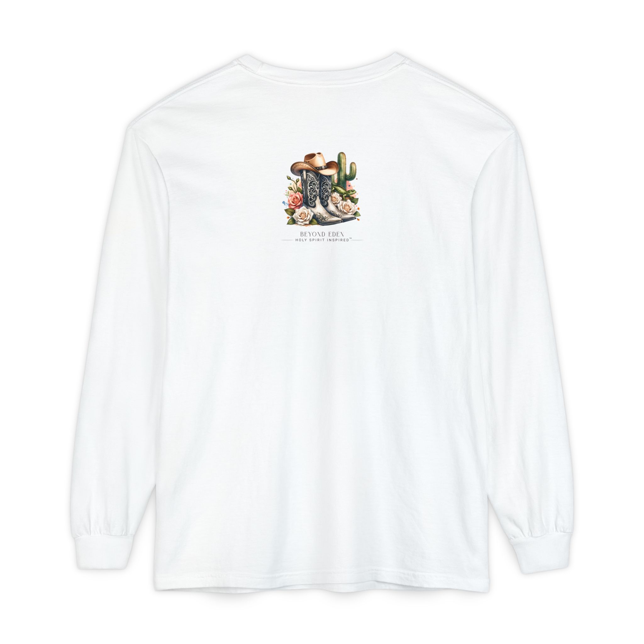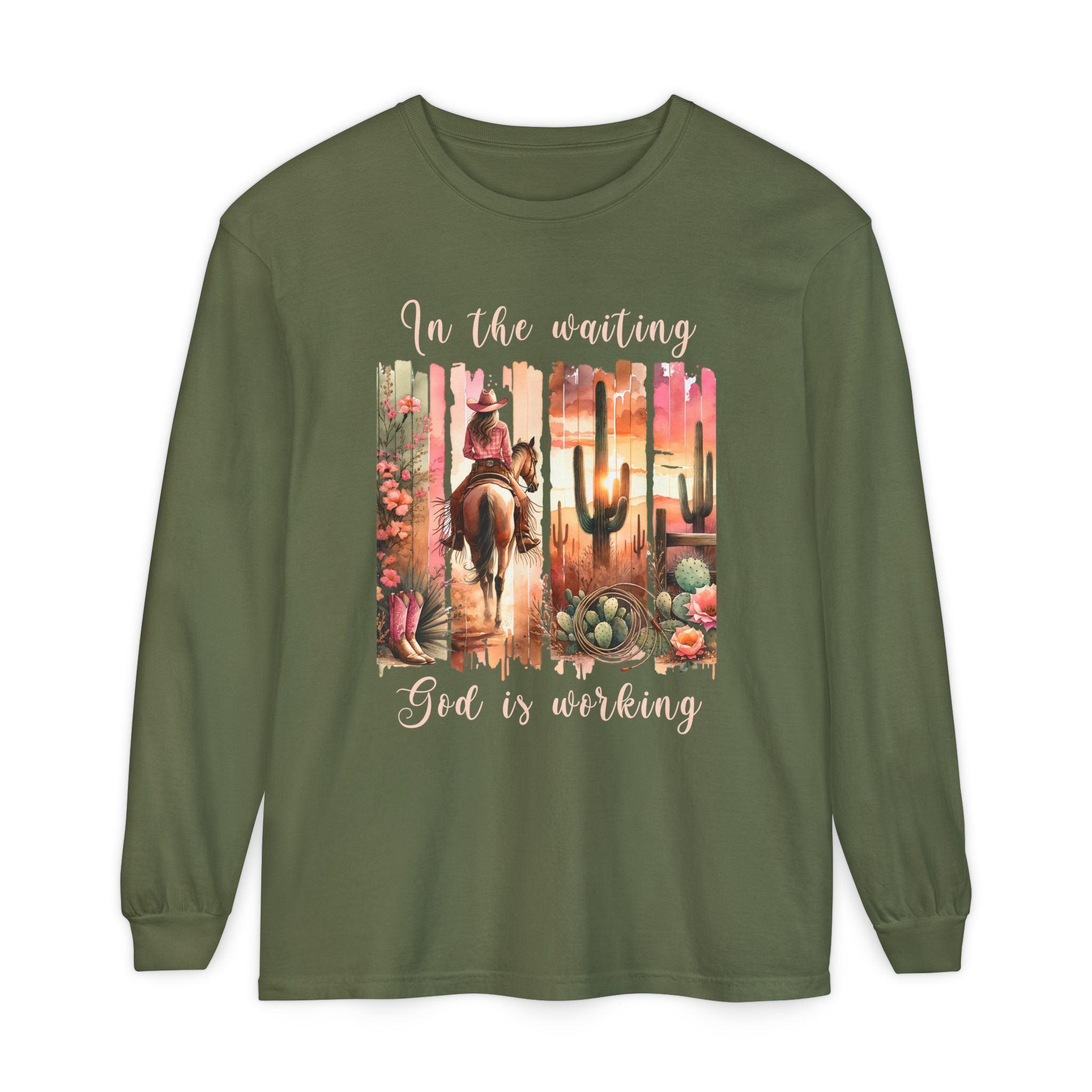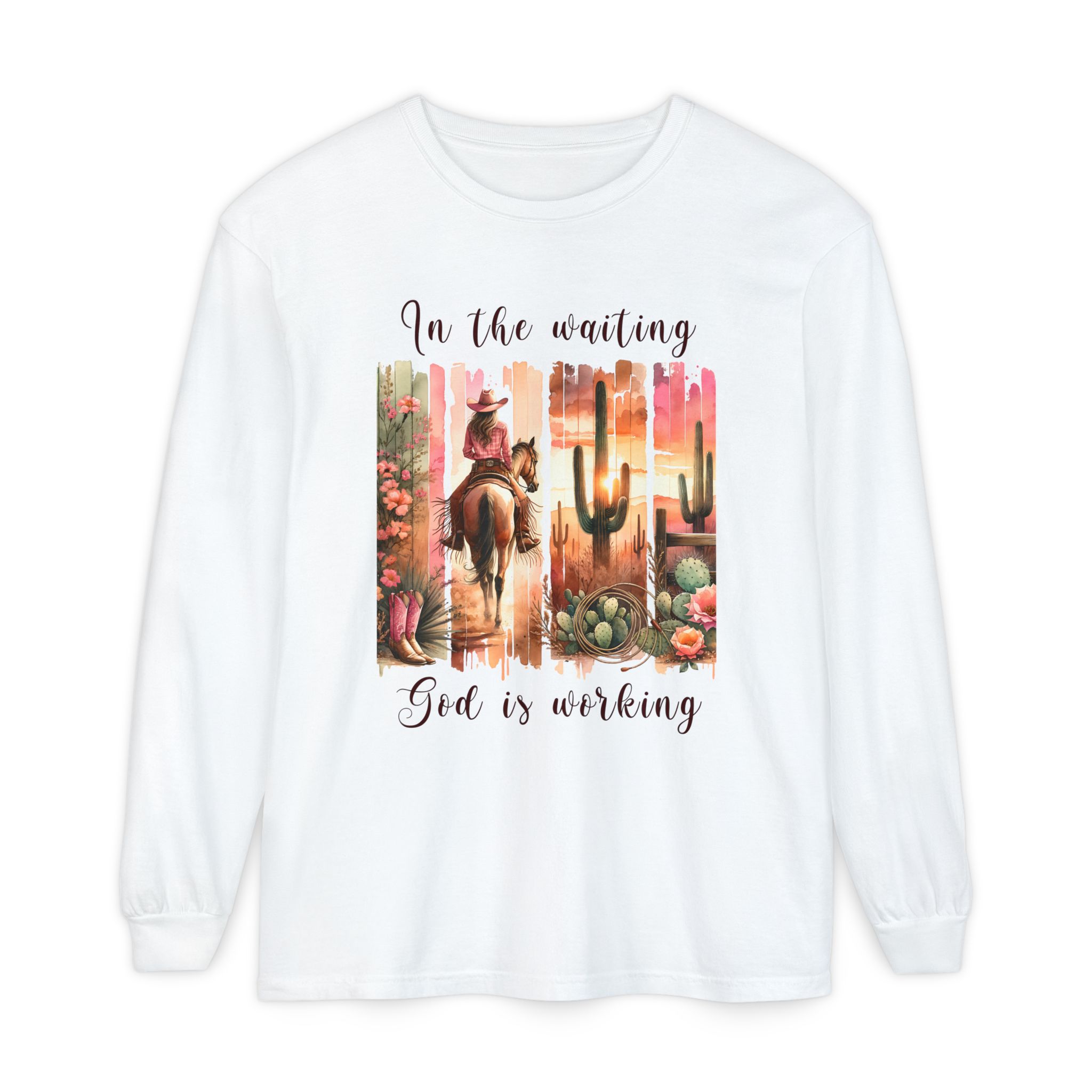 This Comfort Colors® long sleeve tee blends western charm with timeless truth. Featuring a desert sunset scene of a cowgirl riding her horse among cactus and roses, the design reminds us that even in the waiting, God is faithfully at work behind the scenes.