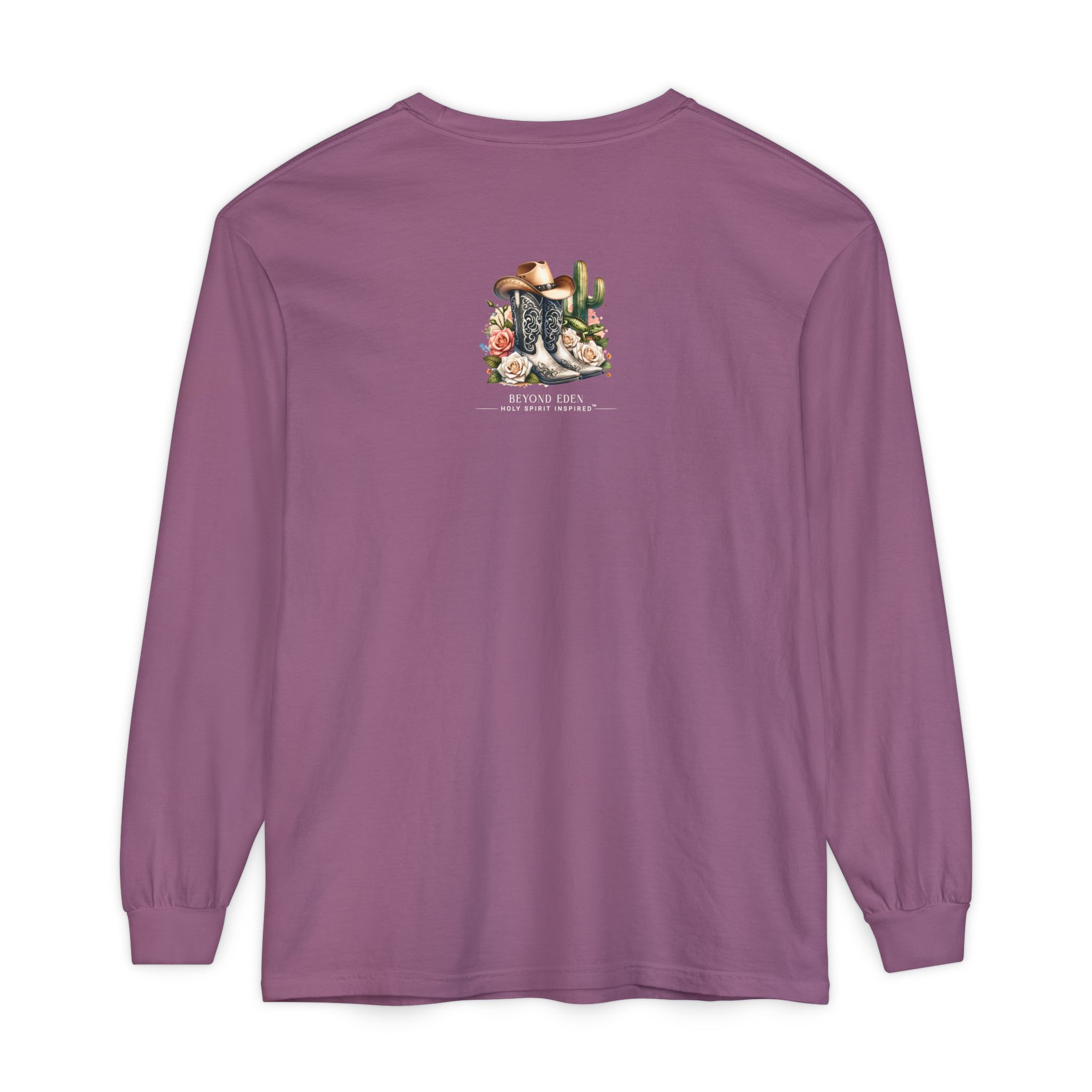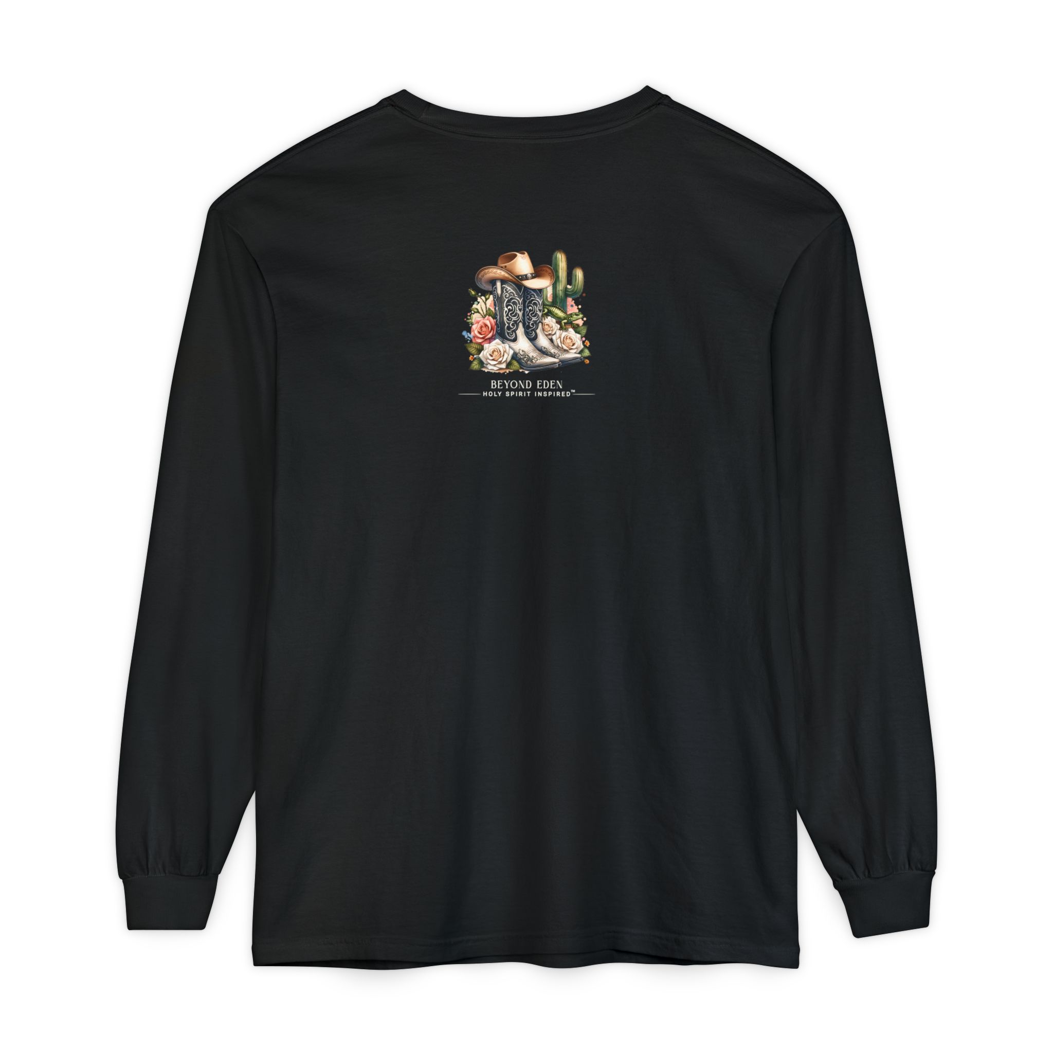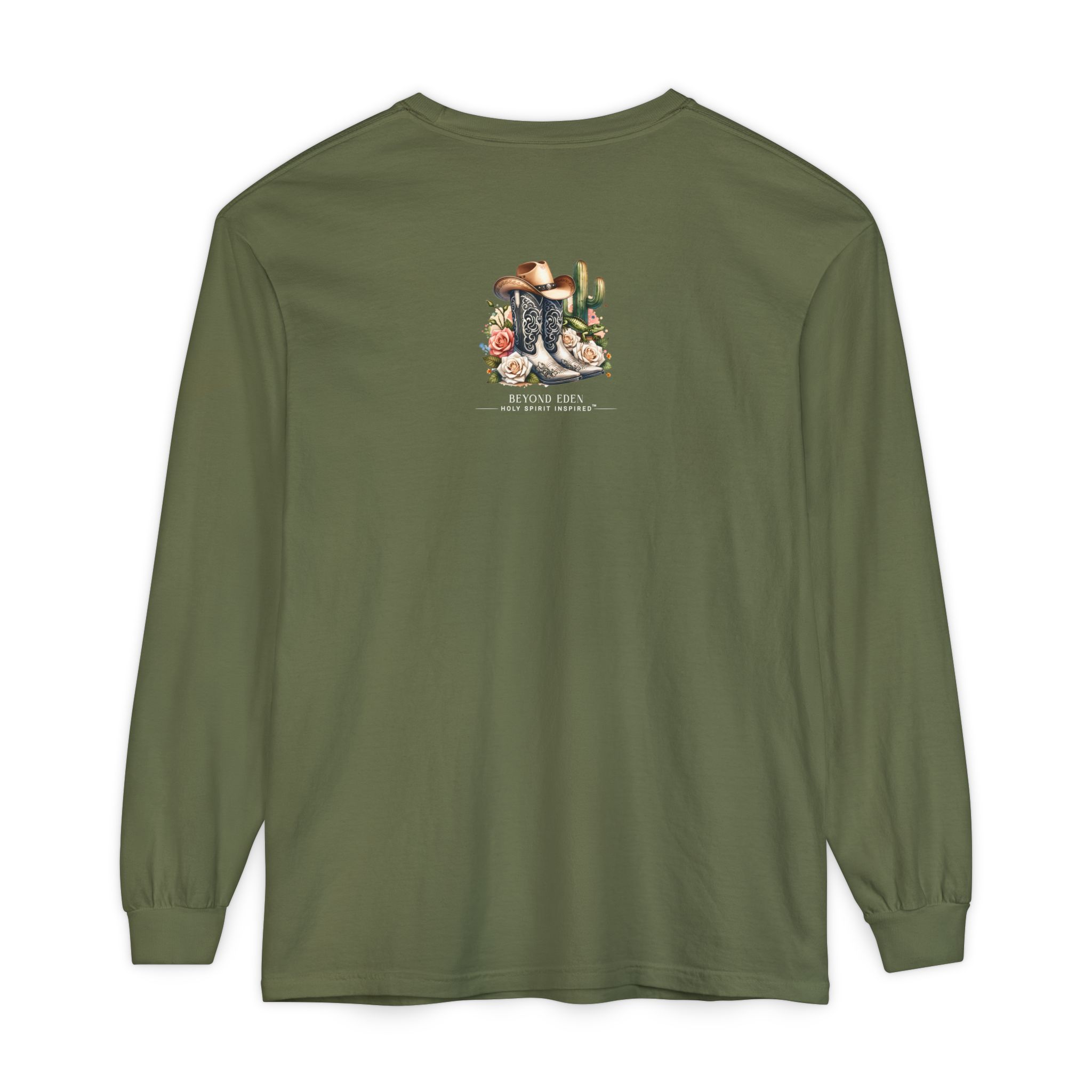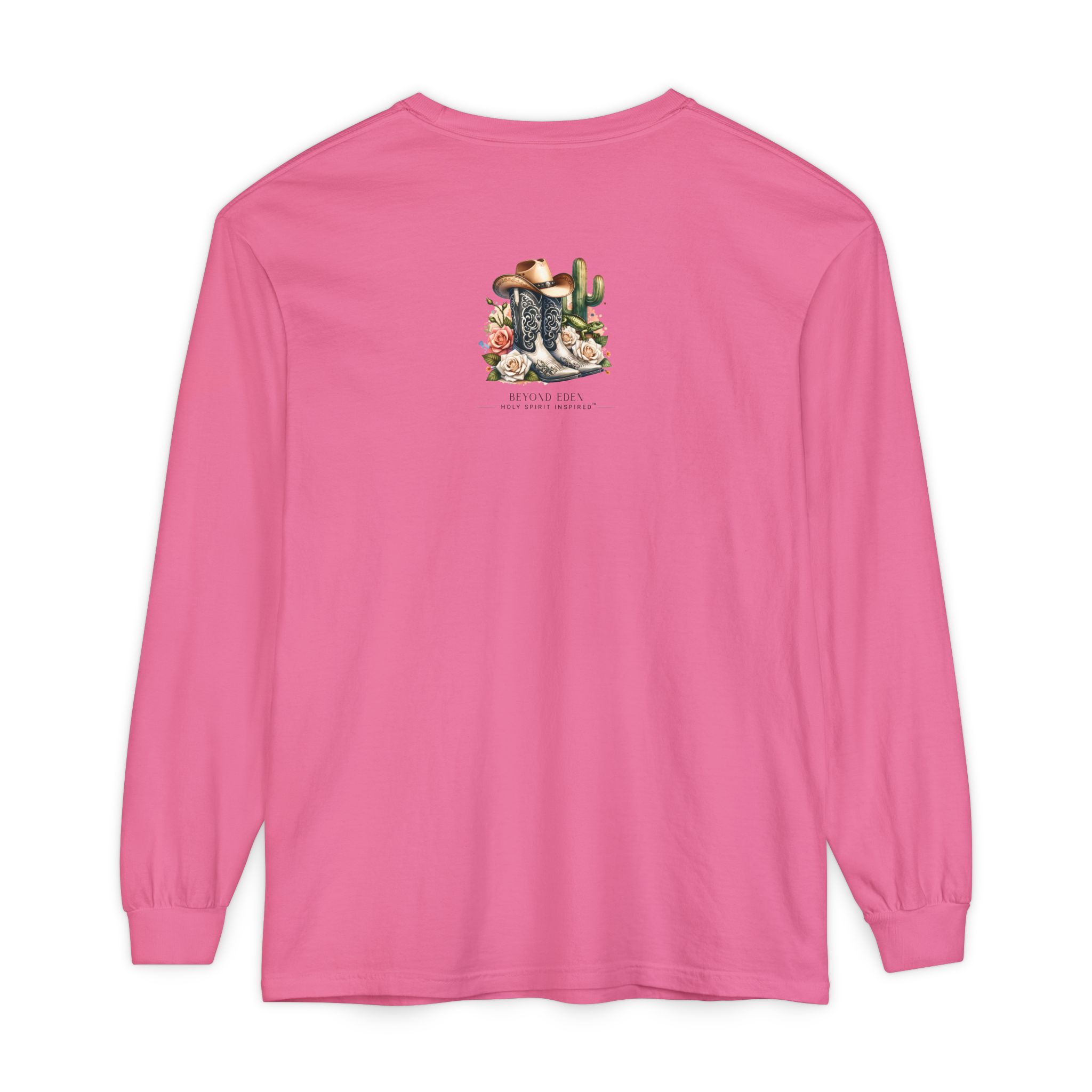 This Comfort Colors® long sleeve tee blends western charm with timeless truth. Featuring a desert sunset scene of a cowgirl riding her horse among cactus and roses, the design reminds us that even in the waiting, God is faithfully at work behind the scenes.
